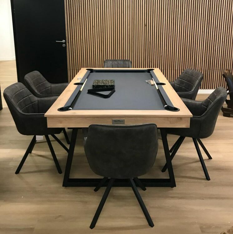 Le Billard Brio Noyer Venice se distingue par sa fonctionnalité 2-en-1 : grâce à un plateau adapté, il se transforme en une véritable table de réunion ou de repas. Cette polyvalence en fait un choix idéal pour les entreprises disposant de peu d’espace ou souhaitant optimiser leurs salles de détente, open spaces ou salles polyvalentes. En quelques secondes, l’espace de jeu devient une surface de travail accueillante et élégante.
