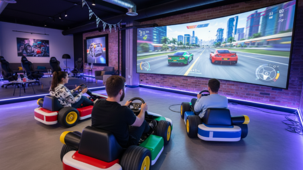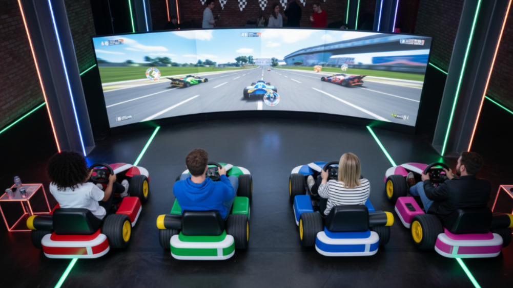 Offrez à vos collaborateurs la possibilité de participer à des courses endiablées sur Mario Kart, WRC10 ou Need for Speed (Switch 2), installés dans de véritables karts en bois éco-conçus. Chaque kart est équipé d’un kit volant + pédales, permettant une conduite réaliste et stimulante, idéale pour créer du lien, libérer la pression et encourager une dynamique positive au bureau.